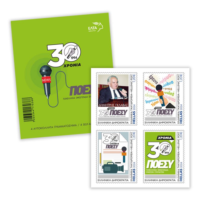 Τα Ελληνικά Ταχυδρομεία, με αφορμή τη συμπλήρωση 30 ετών από την ίδρυση της Πανελλήνιας Ομοσπονδίας Ενώσεων Συντακτών (ΠΟΕΣΥ), που ήρθε να καλύψει την ανάγκη συνολικής έκφρασης εκπροσώπησης και δράσης του δημοσιογραφικού κόσμου της χώρας, κυκλοφορούν το ακόλουθο φιλοτελικό προϊόν, που θα είναι διαθέσιμο από την Παρασκευή, 11 Οκτωβρίου 2024, και θα συνοδεύεται από Ειδική Αναμνηστική Σφραγίδα.