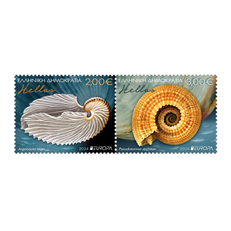 Τα Ελληνικά Ταχυδρομεία συμμετέχουν και φέτος στην Κοινή Ευρωπαϊκή Έκδοση EUROPA 2024 με θέμα «Υποβρύχια Πανίδα και Χλωρίδα», και μας ταξιδεύουν στο βυθό των ελληνικών θαλασσών. Τα δυο εντυπωσιακά γραμματόσημα αναδεικνύουν την απαράμιλλη ομορφιά της θαλάσσιας βιοποικιλότητας, παρουσιάζοντας το περίφημο κέλυφος του γαστερόποδου Pseudotorinia architae και το ιδιαίτερο όστρακο που φιλοξενεί τα αυγά του θηλυκού χταποδιού Argonauta argo.